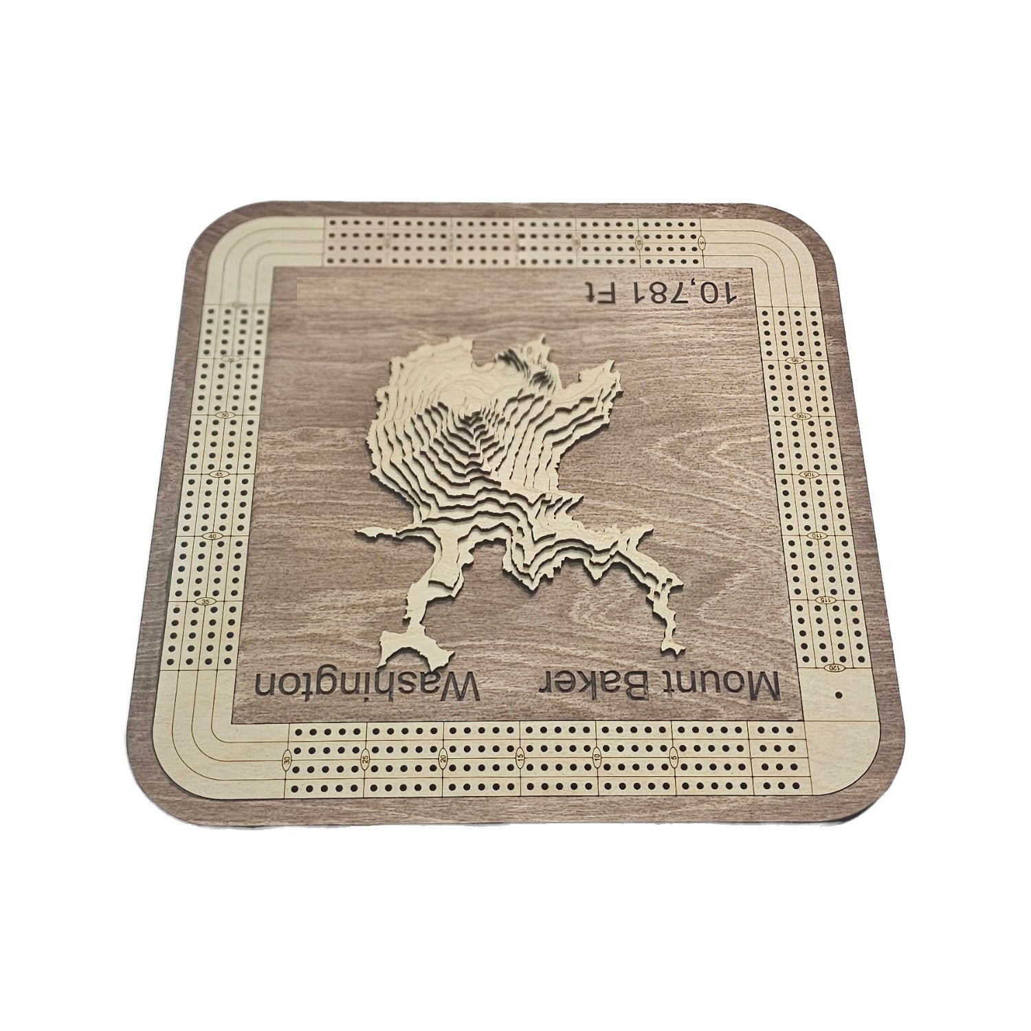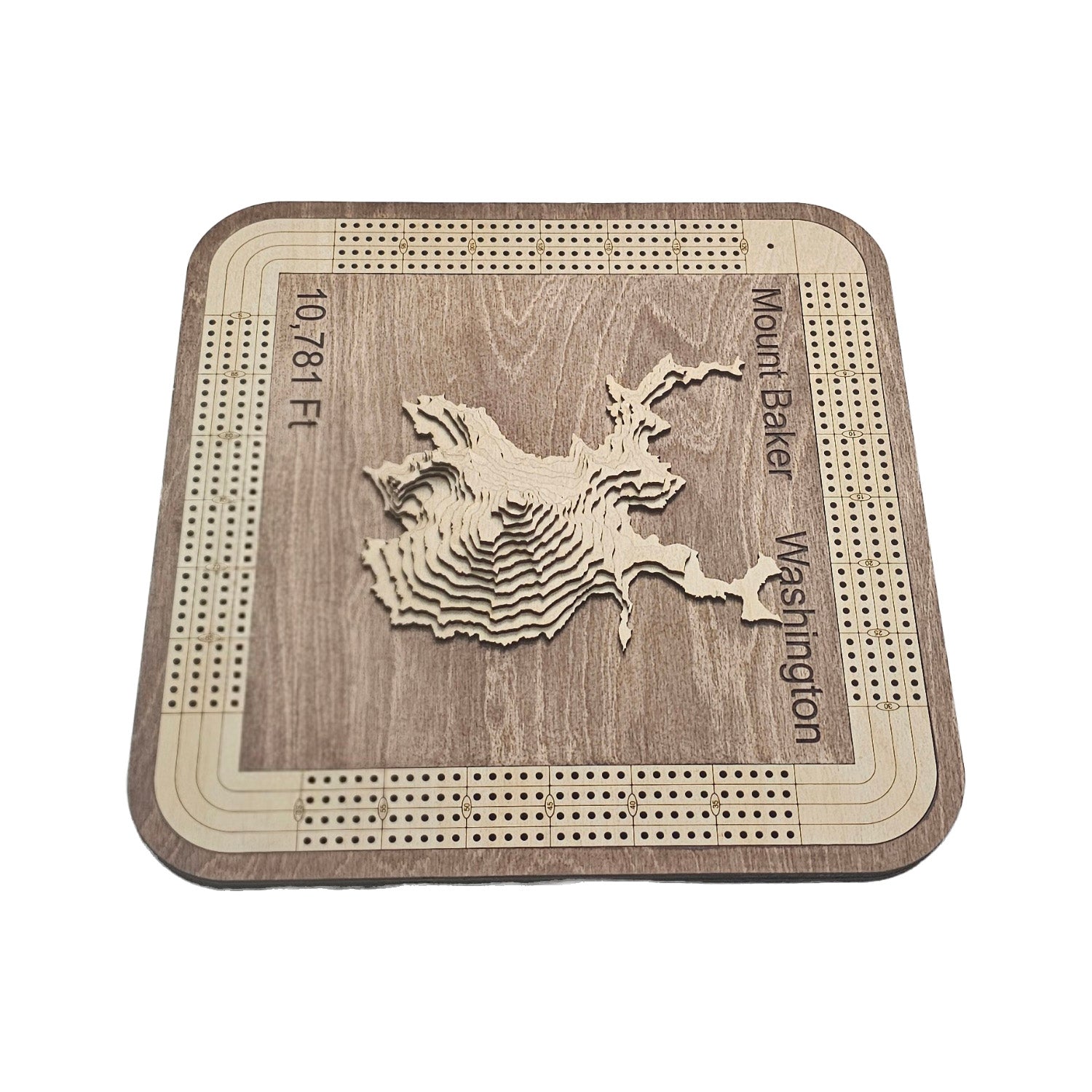 Introducing our captivating 4 Lane Laser Cut Cribbage Board featuring the breathtaking Topography of Mount Baker in Washington state, a harmonious blend of art, nature, and friendly competition. Crafted with precision and creativity, this unique cribbage board showcases the majestic beauty of Mount Baker while providing an engaging and enjoyable gaming experience for up to four players.