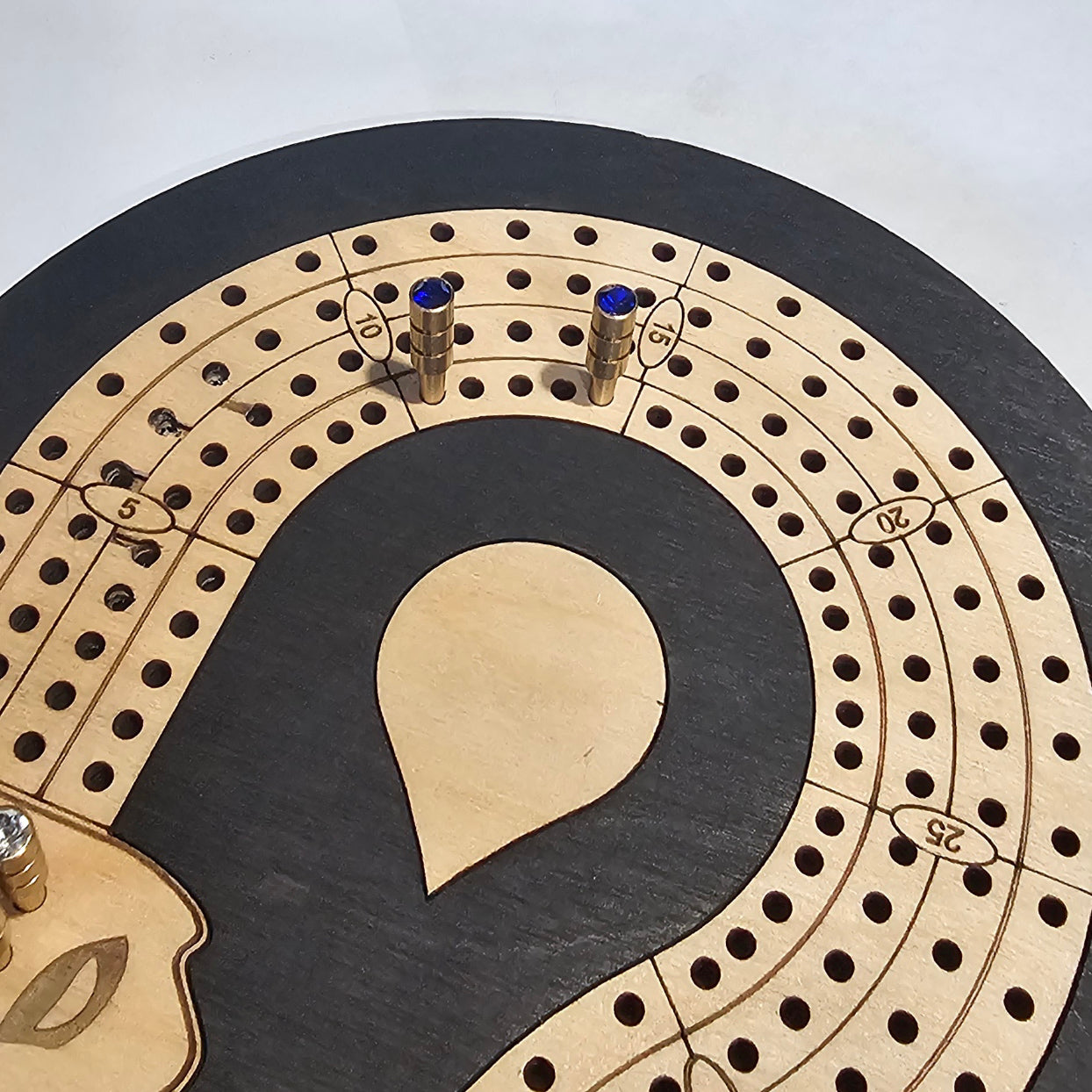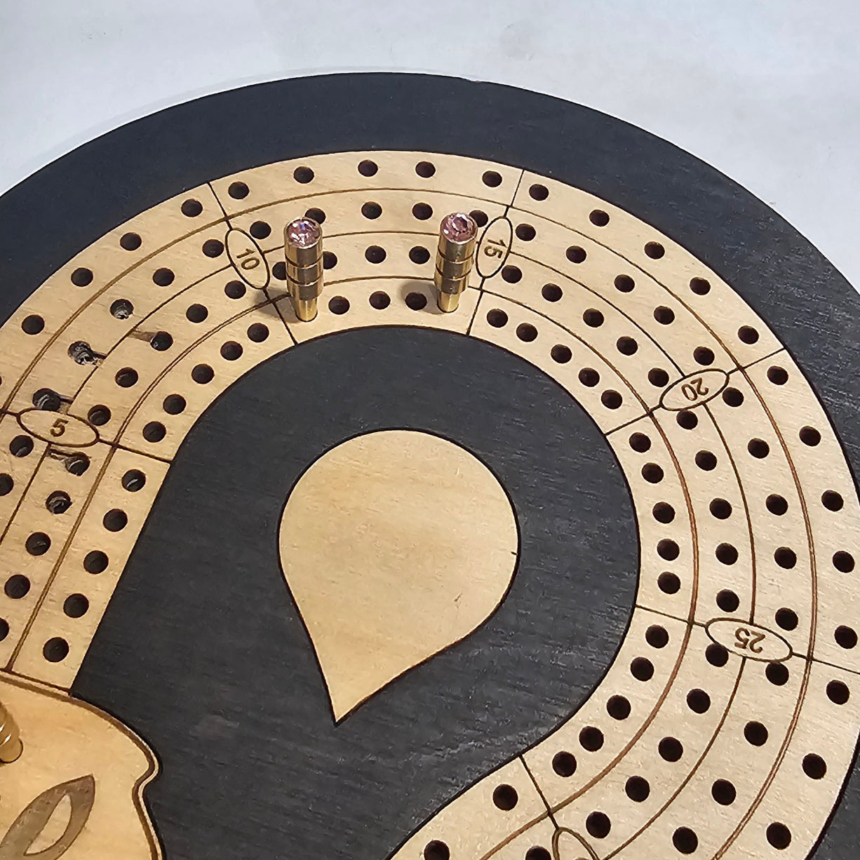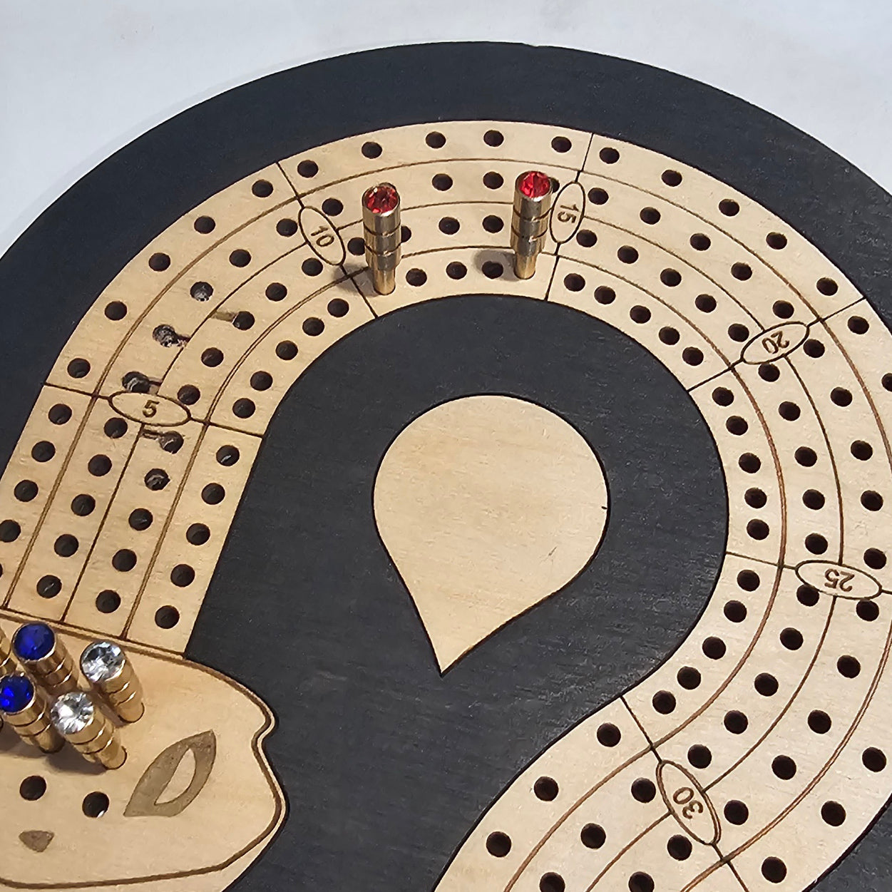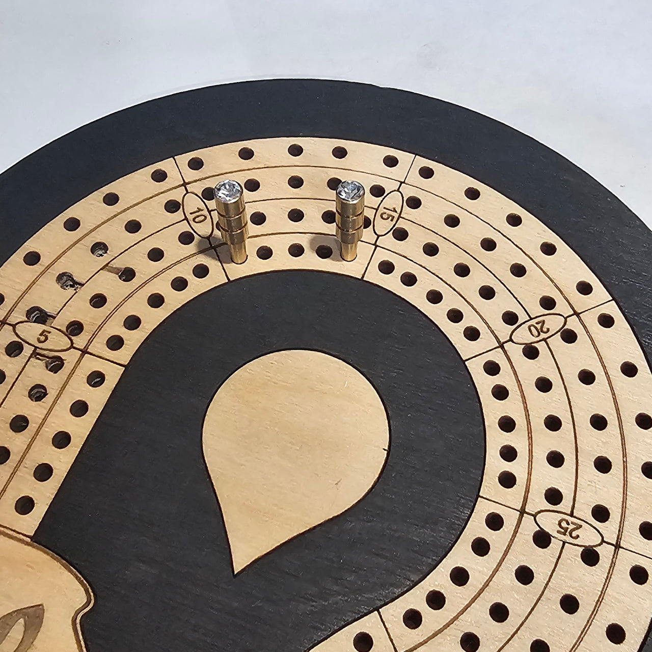 Upgrade your cribbage board with these stylish metal pegs. Made from brass/gold-colored metal, they feature a tapered design to fit standard 1/8" holes and they are 1 3/8" tall. Comes with 3 each of 4 different crystal colors, Red, Blue, Rose and Clear. Comes with a velvet pouch.