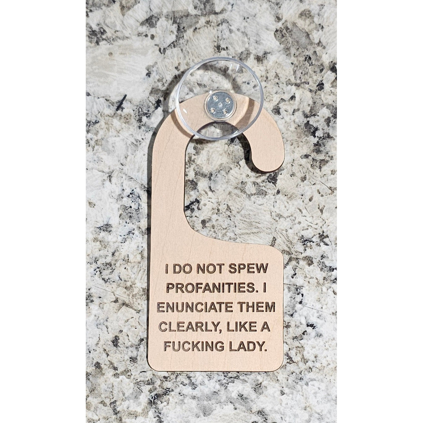 Funny signs for your car, can be hung on the mirror or has a suction cup to attach to a window. Three different phrases to choose from.